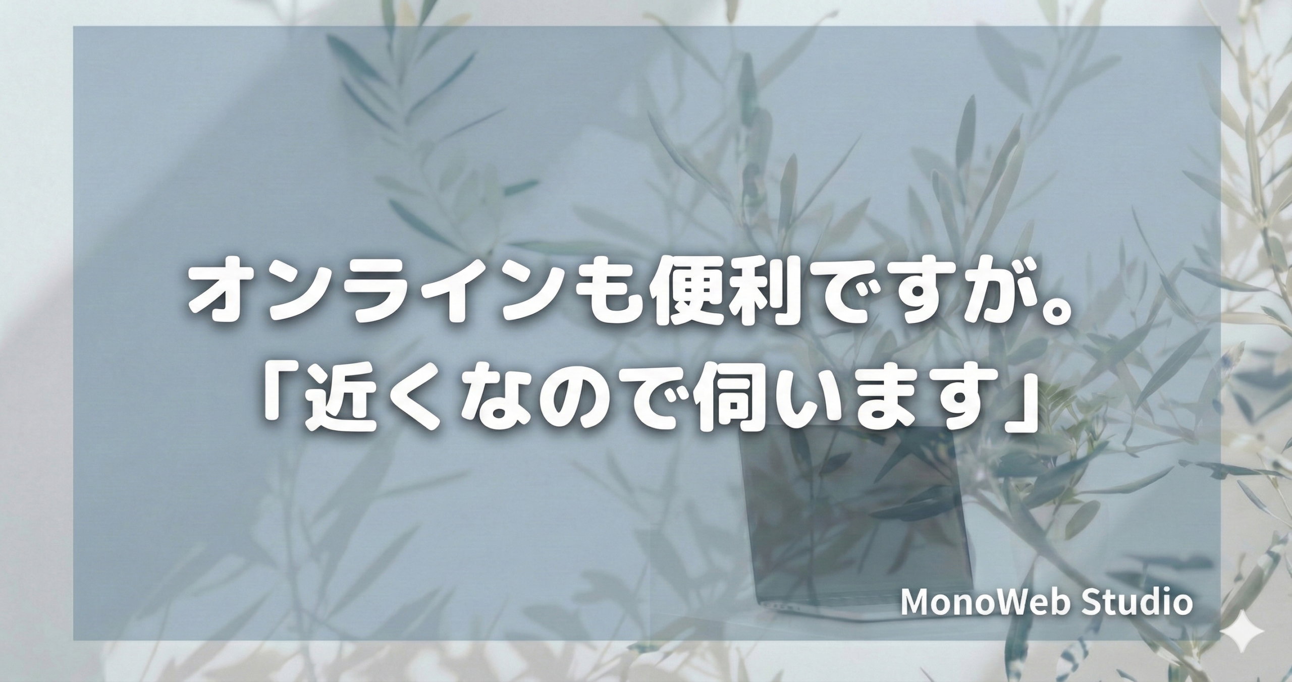対面での打ち合わせなら、 「そういえば、インスタのここが分からないんだけど…」 「パソコンの調子がちょっと悪くて…」 といった、本題とは関係ないけれど、ちょっと困っていることも気軽にお話しいただけます。